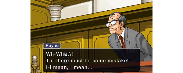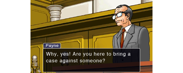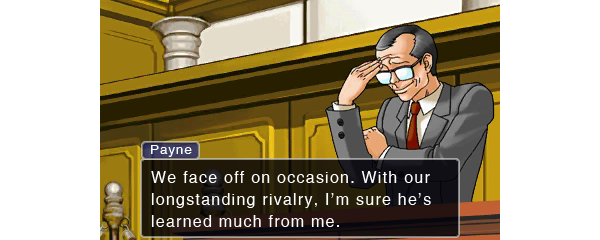 Payne: I make it a point to educate the younger prosecutors and to help them out wherever I can. Take that transfer from Germany, Ms. Franziska von Karma. I tried to tell her I would help her settle in, and all I got in return was a faceful of leather. I was only trying to be a genteel-man.