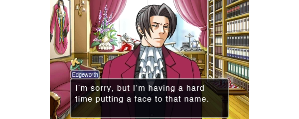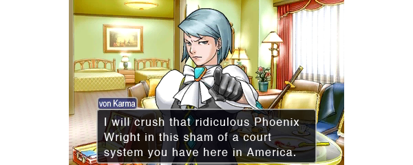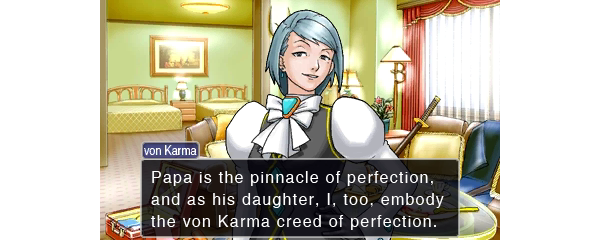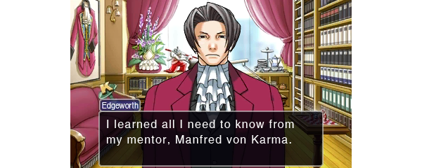 Edgeworth: Mr. von Karma is a man to be respected and feared. It is under his tutelage that I have been able to flourish and make my courtroom debut when I was but 20.