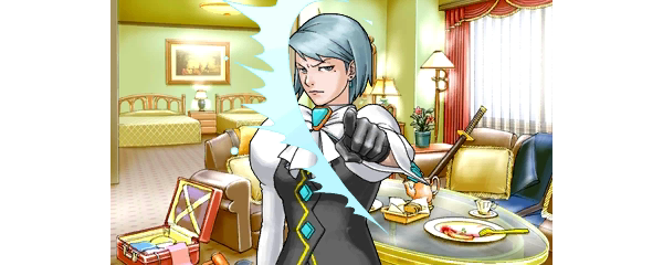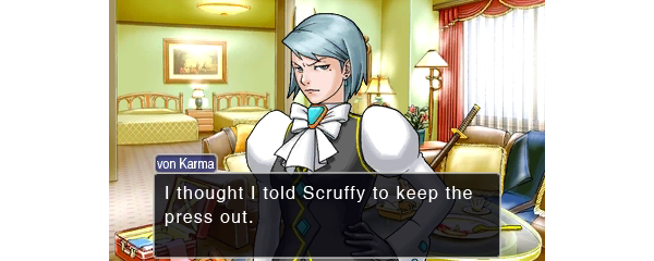 Host: We are here at the Gatewater Hotel, where a criminal investigation is underway. If we are lucky, we just might catch the prosecutor on this case… Oh, there she is! Ms. Franziska von Karma! Do you have a minute?