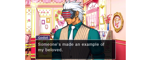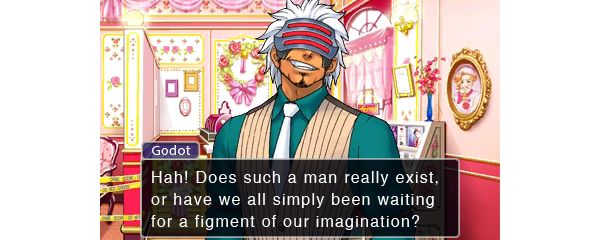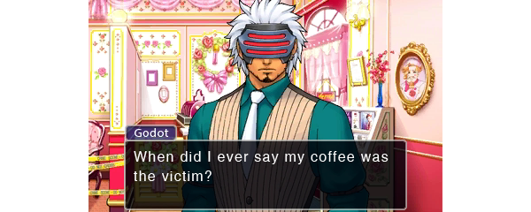 Host: Well, wasn’t today’s show exciting! Let’s review the highlights! We met the “Demon Prosecutor” Mr. Miles Edgeworth, who is as intimidating outside of court as in. Then, we spoke with the vengeful Ms. Franziska von Karma, who likes to speak with her whip apparently. And finally, Mr. Godot, whose history with the Prosecutor’s Office is shrouded in mystery… and very hot coffee, as my 1 st -degree burns will attest to… *holds finger up to earpiece*