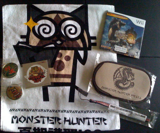 We’ll also be playing these quests tonight and this weekend via AdHoc Party. If you find and play with PSN ID “Snow_Infernus” (that’s me) I’ve got some Monster Hunter swag just for you! If you hunt with me, I’ll send you a prize pack that has: A felyne towel, badges, stickers, PSP case and wrist strap, and a demo for Monster Hunter Tri. See you online!