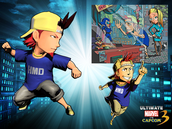 Joe drops his flashy outfit for standard civilian duds seen throughout the Viewtiful series. The dev team considered using Captain Blue or even Joe cosplaying as Captain America (as seen in the MvC3 credits) but went for this instead; the other options wouldn’t change Joe’s silhouette much, whereas this outfit mixes things up.