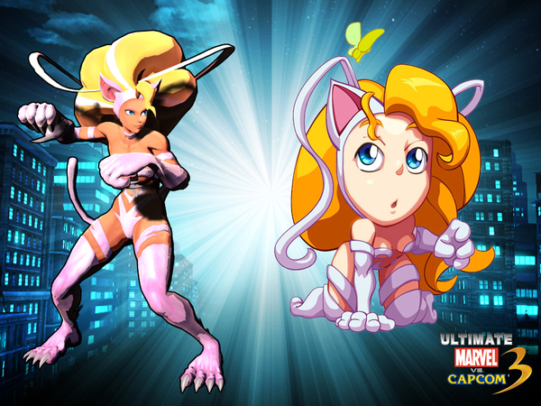 The 2P costume is a throwback to a popular blonde version of Felicia. This is actually her alternate costume in a couple of games, but we used Puzzle Fighter as a reference, mostly because I love Puzzle Fighter. How cute!