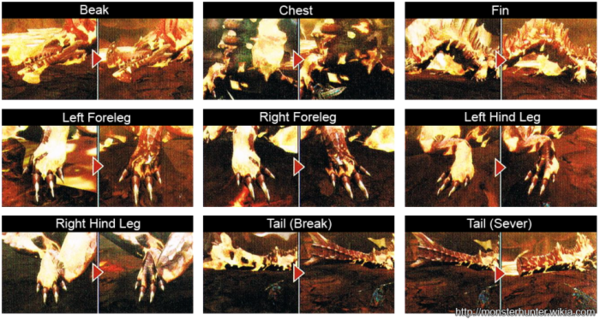 Just about every part of the Agnaktor can be broken and his tail cut off. His beak, fin, and four legs can be damaged by applying enough damage to them. This picture will serve as a great reference to see what the parts look like when they are normal and when they are broken.