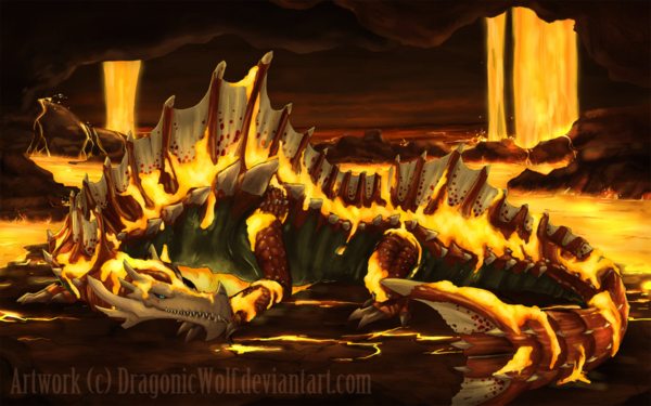 “ Also known as Fire-Pike Wyverns, Agnaktor use their tough snout and great strength to burrow through rocks and sometimes even the cave ceilings. It is encrusted with hardened lava that can be softened from the heat when they spit magma or burrow. ”