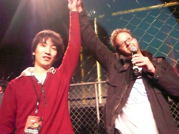 The Grand Finals were a great display of non-standard characters, with Mike Ross continuing to rep E. Honda vs Justin Wong’s relentless Rufus.  Although Honda has a very strong defense, Wong made the most of his opportunities, and put the offensive burden on Ross with careful spacing that required Honda to move forward to attack, thereby preventing Honda from also using his two best threats (torpedo and butt-flop, both of which can’t be charged while walking forward).  After a brief celebration with his EVO Golden Ticket and the GameStop SFIV Champion Cup, it was time to face the best the world has to offer.