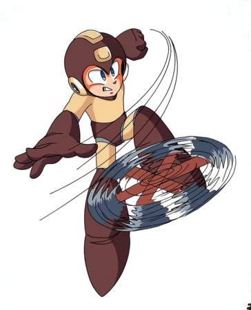 Strangely enough, the weapon you receive from him bears no resemblance to what he uses in battle. While he throws out dual propellers and uses his fans to push or pull Mega Man, the Blue Bomber instead receives a small tornado that moves much like Bubble Lead — and even adorns him in the same colors!