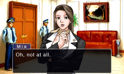 Host: According to my sources, the other half of the Wright & Co. Law Offices should be here in Defendant Lobby No. 4 somewhere… Aha! I do believe we’ve found her! Ms. Mia Fey! “Great People Around Town” here, and we’d like to interview you for our segment, if you don’t mind.