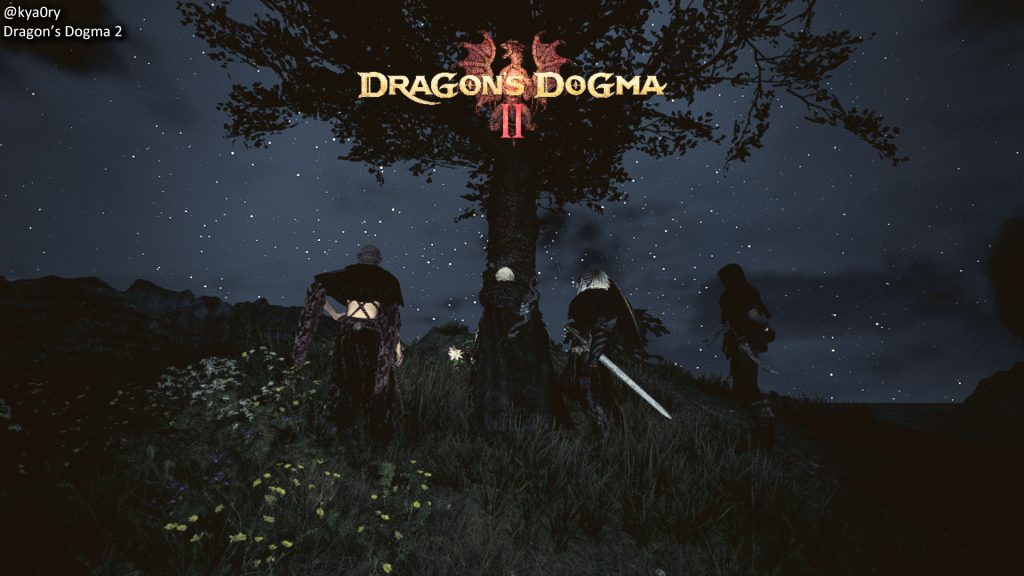 kya0ry takes a moment to pause at a tree on a starry night in Dragon’s Dogma 2.